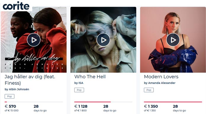 Чотири артиста встановили досить низьку планку для перших кампаній, намагаючись залучити від £1,350 і €1,800 для своїх перших релізів. Винятком став Johnsén, який намагається зібрати €15 тисяч для своєї першої кампанії на Corite. Кожна кампанія містить мету, щр вимірюється стрімами, а не продажами. Мета Johnsén для його треку «Jag håller av dig» – 5 млн стрімів; для своєї пісні «Modern Lovers» Amanda Alexander вибрала позначку в 450 тисяч стрімів.